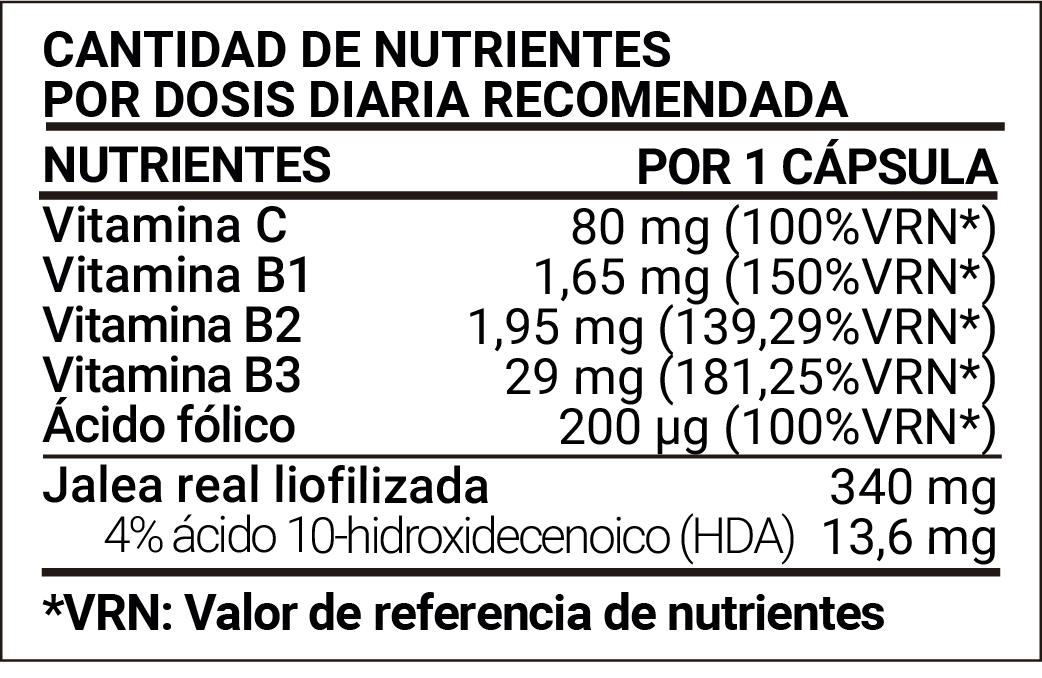 Cada cápsula combina Vitaminas C, B1, B2, B3 y B9, que ayudan a reducir el cansancio, apoyan el sistema inmunológico y favorecen el metabolismo energético. Perfecta para momentos de mayor desgaste o fatiga.
